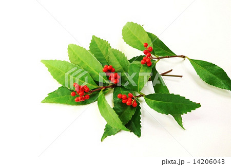 年賀素材・千両の実と葉小枝複数・白バック横位置