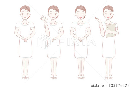 立ち姿・OKサイン・カルテを持つ・案内するエステティシャンの全身ポーズイラストセット_白