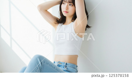 美肌の両脇を上げている笑顔で美しい若い女性 綺麗な脱毛のイメージ