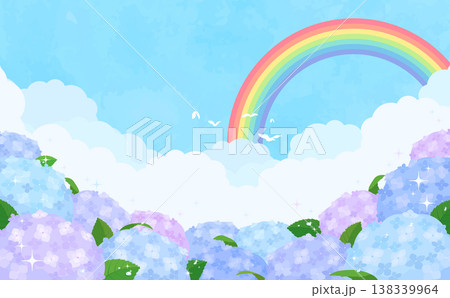 カラフルなあじさいと虹の背景_横