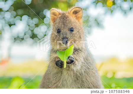 クオッカ、手に葉っぱを持って微笑む幸せな動物、ロットネスト島、西オーストラリア