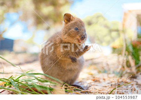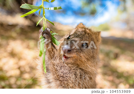 西オーストラリア州ロットネスト島にて最も幸せな動物クオッカは食事を楽しんでとても幸せ