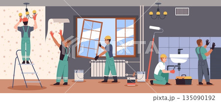Home interior renovation. Professional builders and repairmen, workers glue wallpaper, install windows and plumbing in apartment, tidy vector cartoon isolated teamwork contraction concept