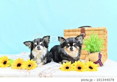 スタジオ撮影の準備をする女性と2匹のチワワ