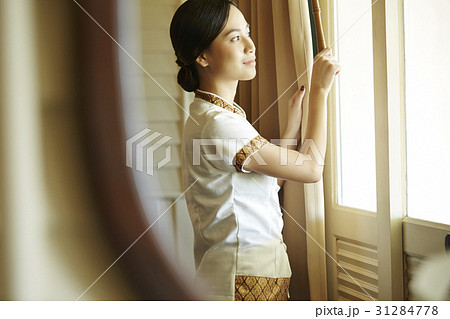 A photo of a Thai beautiful girl in uniform in a spa
