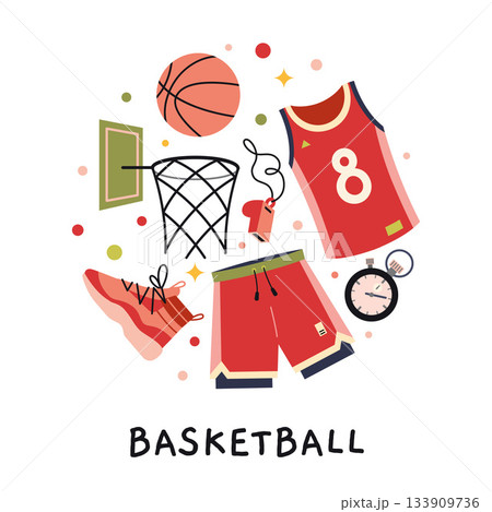 A circular composition with basketball concept. Ball, jerseys, shoes, hoop, whistle and accessories for team game. Trendy vector illustration isolated on white, hand drawn, flat design