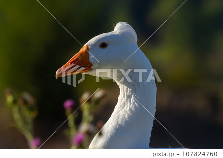 Side view of white-gray domestic full-grown fat healthy goose standing on green grass in yard on bright sunny day. Farming, geese breeding and ecological healthy meat and feather production concept.