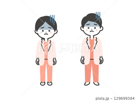暗い表情のスクラブに白衣姿の3頭身男女医師イラスト