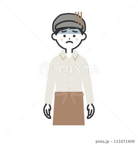 どんよりした表情の帽子をかぶってエプロンを付けた男性イラスト