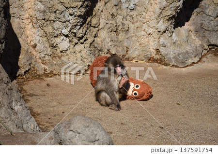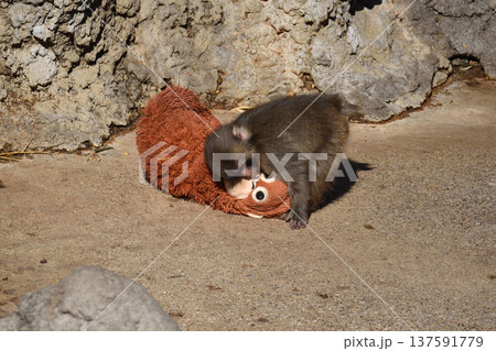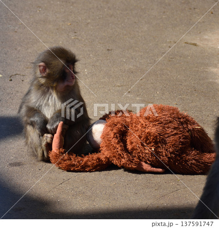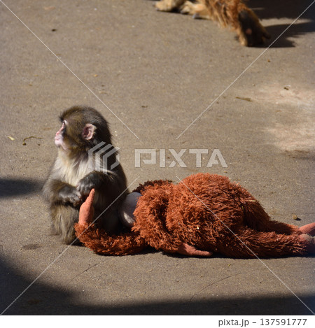 オランウータンぬいぐるみとパンチ、市川動植物園のニホンザル