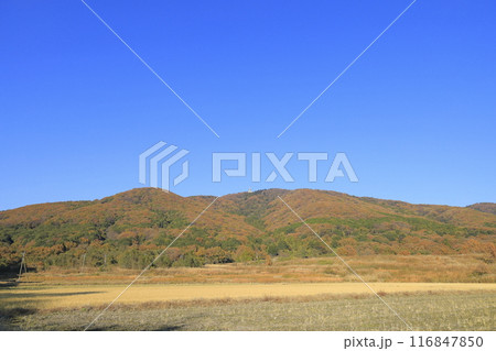 快晴の下、色鮮やかに紅葉した茨城県の秋の宝篋山(ほうきょうさん)