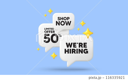 We are hiring tag. 3d offer chat speech bubbles. Recruitment agency sign. Hire employees symbol. Hiring speech bubble 3d message. Talk box stars banner. Vector