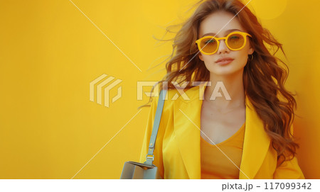 黄色いスーツを着た外国人女性
