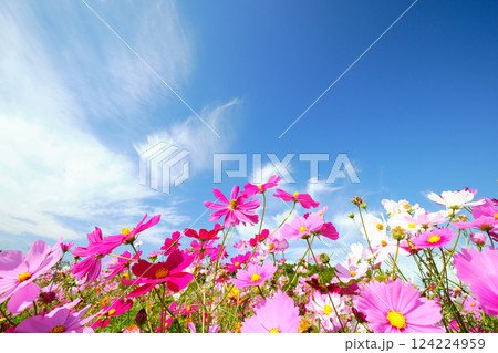 ピンクのかわいい鮮やかなコスモス ふんわり青空背景