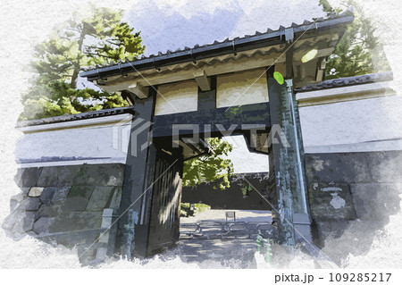 水彩画風 東京北の丸公園 北桔橋門 東京都千代田区