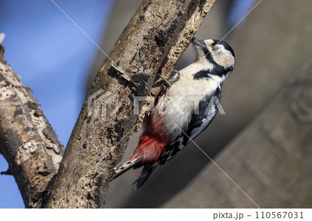 木の実を食べるオオアカゲラ、大赤啄木鳥、エゾオオアカゲラ アカゲラ 北海道野鳥