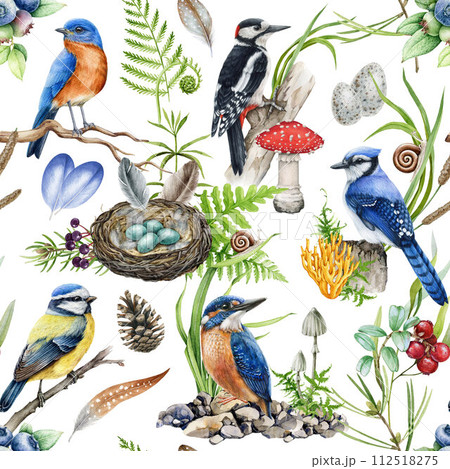 Forest birds with natural elements seamless pattern. Hand drawn woodpecker, jay, kingfisher, blue tit with forest natural elements, mushrooms and greens. Wildlife nature seamless pattern with birds