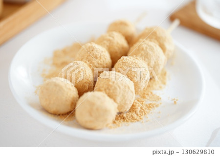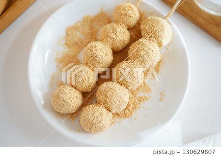 きな粉をつけて食べる生麩で作られた白玉団子。