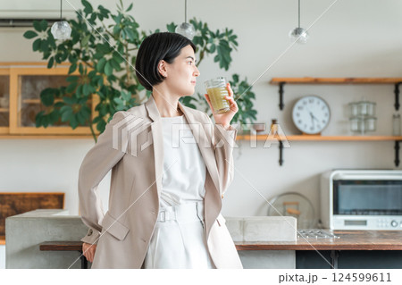 ダイニングでプロテイン,牛乳,カフェオレ,豆乳を飲む若いアジア人女性