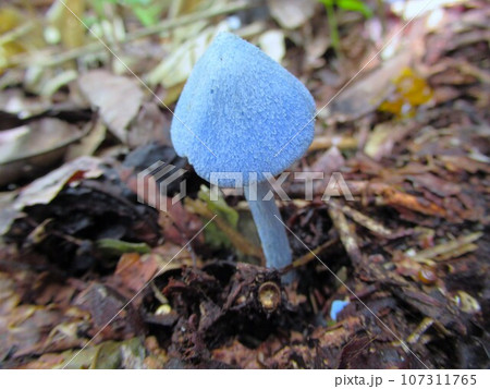 富士の樹海にひっそりとはえるキノコ「ウスフジフウセンタケ」(山梨県富士吉田市)