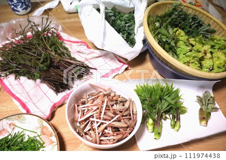 テーブルの上にある下ごしらえ済みの収穫した6種類の山菜