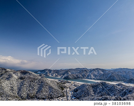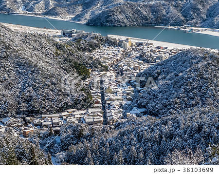 雪景色の城崎温泉外 晴れ渡る日本海と冬景色の城崎温泉