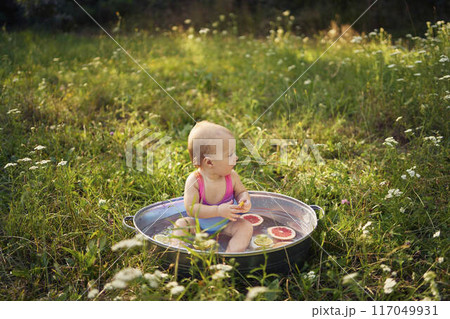 a baby in a metal bath in a summer garden plays with grapefruit and lemon slices