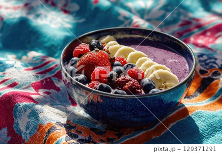 vibrant blue bowl filled with a purple smoothie, topped with banana slices and berries