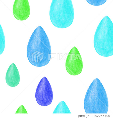 Seamless pattern with blue and green drops, drawn with colored pencils. A pattern of multicolored raindrops is isolated on a white background. Seamless background for nursery wallpaper, packaging