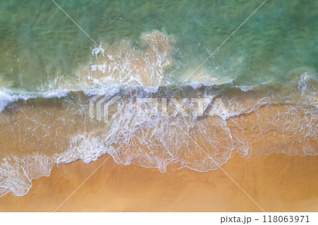 Amazing Top view sea beach landscape background,Summer sea waves crashing on sandy shore seascape background,High angle view ocean nature background