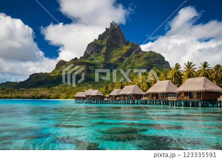 Serene island with modern skyscrapers surrounded by calm water and palm trees. Earth day concept.