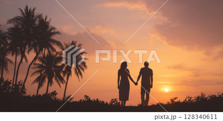 A romantic silhouette of a couple holding hands on a tropical beach at sunset, with a palm tree in the foreground, evoking themes of love, romance, and idyllic getaways