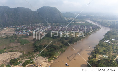 Aerial view of Mae Kok river flowing through Chiang Rai province of Thailand. This river is the blood line for people of Chiang Rai, started from the hills on boarder of Myanmar.