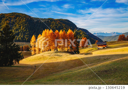 Lovely yellow larches in sunlight. Location place Dolomiti, Compaccio village, Alpe di Siusi, Province of Bolzano - South Tyrol, Italy, Europe.