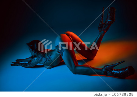 submissive woman in lingerie with sexy ass in leather handcuffs sitting on the bed
