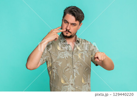 Young man expresses raw emotion of fear and desperation with intense facial expression and gesture