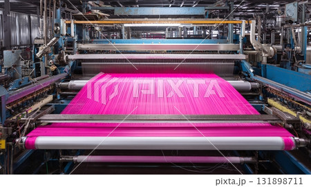 Automated Textile Production: A weaving machine processes vibrant pink threads in a factory, showcasing the industrial process of fabric creation.