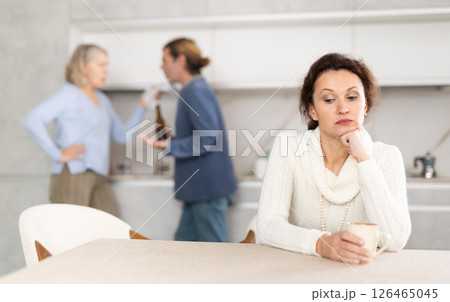 Frustrated woman sitting in kitchen during quarrel between her husband and elderly mother.