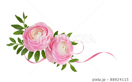 Pink ranunculus flowers and silk ribbon bow in a beautiful floral arrangement isolated