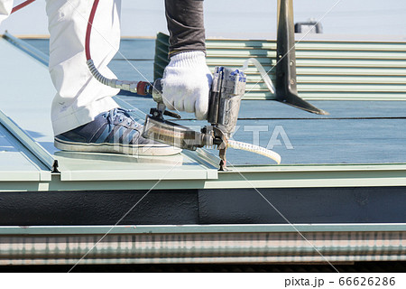 屋根のガルバリウム鋼板にネイルガンで釘を打つ作業