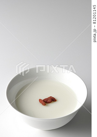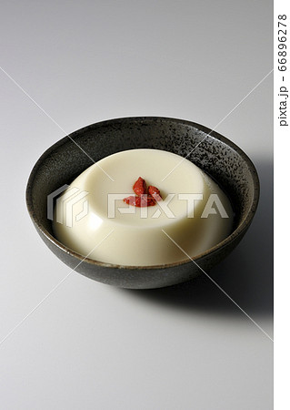 クコの実が乗っているシンプルな杏仁豆腐を白背景で撮影