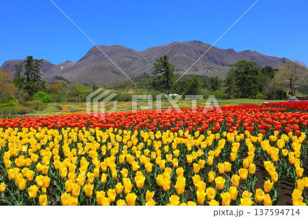 くじゅう連山と満開のチューリップ畑(くじゅう花公園)
