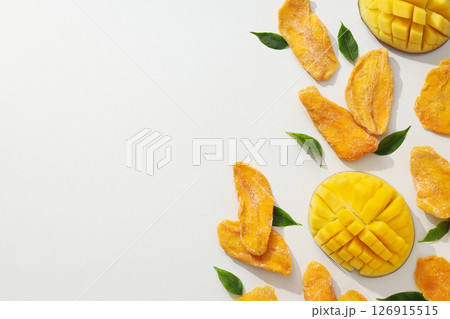 Mango fruit with slices isolated on white background with copy space for your text. Top view. Flat lay