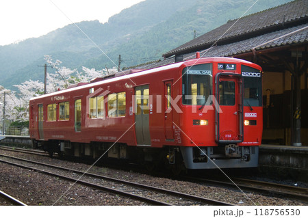 桜咲く春の肥薩線を駆ける列車