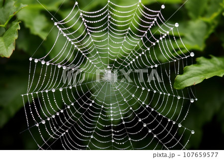 The spider web with dew drops, green leaves on the background