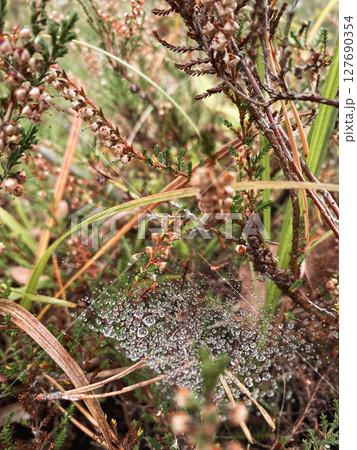 Captivating and intricate nature scenes showcasing dew upon grass blades and delicate spider webs