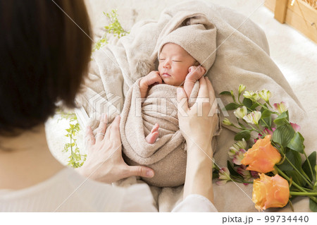 ニューボーンフォト撮影の準備をするお母さんと赤ちゃん