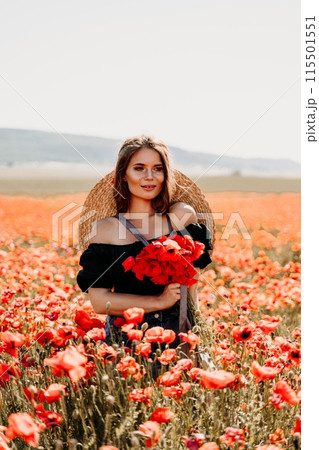 Woman poppies field. portrait happy woman with long hair in a poppy field and enjoying the beauty of nature in a warm summer day.