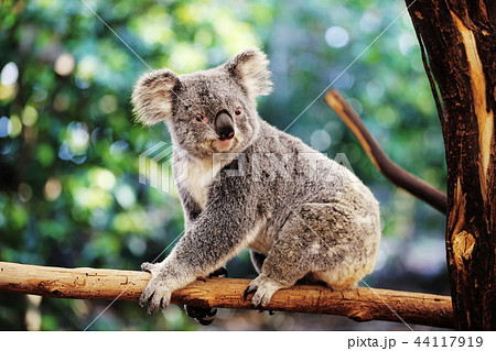 子コアラ。コアラの子どもが木の上に座って休んでいる。