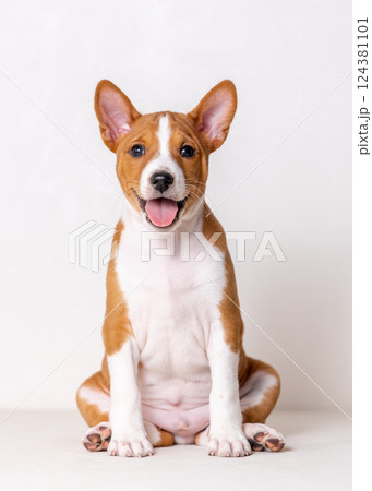 Close-up portrait of a cute red and white Basenji puppy sitting with his mouth open and looking at the camera.